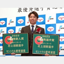 28日、都内で行われたNPBアワードに出席。壇上で喜びを語った。新人王とのダブル受賞は1980年の木田勇(日本ハム)、90年の野茂英雄(近鉄)以来3人目。セ・リーグでは初の快挙となった。村上は「プロ野球では野茂さん以来でセ・リーグでは初なので、名を刻めたってことはとても良かったかな」と笑みを浮かべた。