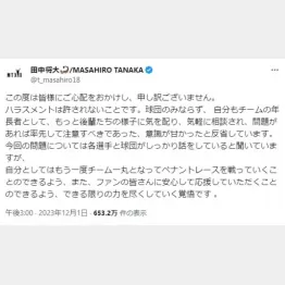 「二人はチームメートかつ、投手同士です。40人もの選手がパワハラを見聞きしていたのに、知らぬ存ぜぬは通りません。田中は以前から似たようなパワハラ行為があって、感覚が麻痺していたのではないか。田中が高校生の時はまだスパルタ式が当たり前の時代で、先輩からのしごきが普通だった。今や昔の様なやり方が見過ごされるような時代ではありません。今回の彼の投稿を見ても、ひょっとしたら何が悪いのかすら、ピンと来ていないと思ってしまいます」