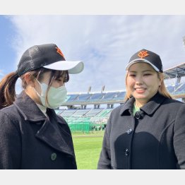 《巨人 ひなたサンマリンスタジアム宮崎》 ――あなたはどちら様? くれは 20代 大学生(写真右) ――どこから来たの? 東京で女子大生やってます ――好きな選手は誰かな? 鈴木大和選手(24=育成)です ――応援メッセージをお願いします 2013年の楽天に負けた日本シリーズから巨人ファンになりました。鈴木大和選手は守備がうまい。支配下になって活躍して欲しい! ◇ ◇ ◇ ――あなたはどちら様? みさき 20代 大学生(同左) ――どこから来たの? 同じく東京の大学生です