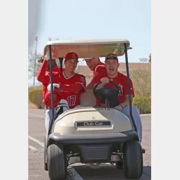エンゼルス1年目の春季キャンプでのひとコマ。カートを運転するトラウトが待ち受ける大報道陣に突っ込もうとする悪ノリに助手席で苦笑い。