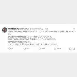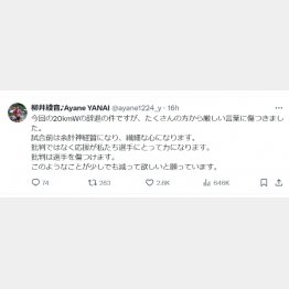 日本陸連が29日に発表した、女子20キロ競歩代表の岡田久美子(32=富士通)と柳井綾音(20=立命大)の出場辞退の一件。理由は「(新種目の)男女混合リレーに専念するため」としたが、この決断に賛否の声が相次ぎ、柳井はSNSでの誹謗中傷に対し、自身のⅩ(旧ツイッター)で「今回の20kmWの辞退の件ですが、たくさんの方から厳しい言葉に傷つきました。試合前は余計神経質になり、繊細な心になります。批判ではなく応援が私たち選手にとって力になります。批判は選手を傷つけます。このようなことが少しでも減って欲しいと願っています」と訴えた。