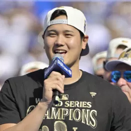 パレード後、ドジャースタジアムで行われた祝勝会でマイクを握ると「僕にとって特別な瞬間です。ここにいられること、このチームの一員でいられることができてとても光栄です。おめでとう、ロサンゼルス。ファンの皆さん、ありがとう」と流暢な英語でスピーチした。