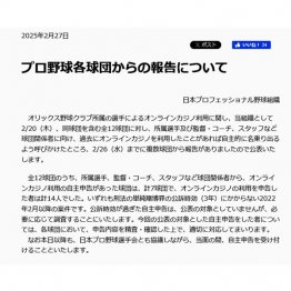 日本野球機構(NPB)は昨27日、12球団を対象としたオンラインカジノの利用についての報告を公表。12球団の所属選手、監督、コーチ、スタッフなどの球団関係者から自主申告があったのは「7球団14人」。球団名、実名は公表されず、処分も各球団の判断に委ねるという。