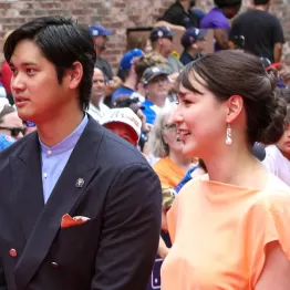 真美子夫人が今年4月に長女を出産してから初めて公の場で2ショットを披露した大谷夫妻。大谷は紺のスーツに白いスニーカー、夫人は球宴開催地であるジョージア州名産の黄桃にちなんでオレンジ色のドレスを身にまとってファンの前を歩いた。
