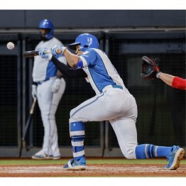 5日の西武戦の三回裏だった。3点を先制してなおも1死二、三塁の好機で打席に入った5番の万波中正(25)に、新庄監督がまさかのサインを送る。リーグ2位の17本塁打をマークする若き大砲に、今季初の犠打にしてプロ7年目で初のスクイズ(写真)を指示したのだ。